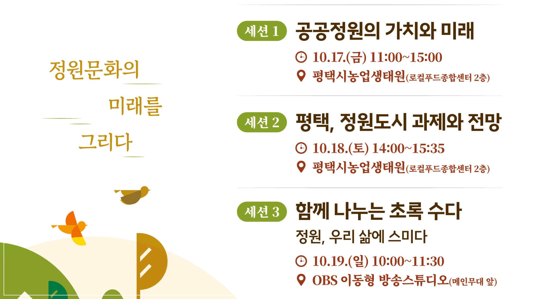 '공공정원의 가치와 미래', '평택, 정원도시 과제와 전망', 그리고 시민 토크콘서트인 '정원, 우리 삶에 스미다; 함께 나누는 초록 수다' 등 정원에 대한 깊이 있는 이야기를 나눌 수 있는 시간도 마련되어 있어요.