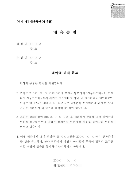 ✔️내용증명(대여금) 샘플 양식